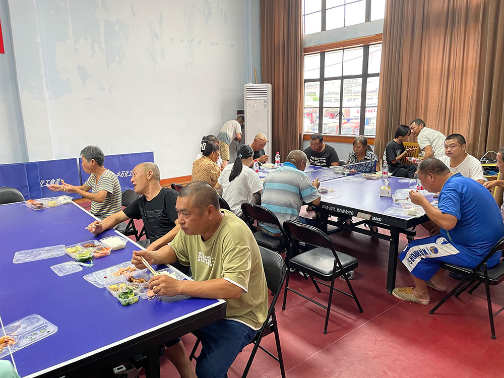石化街道防汛安置点内,居民在乒乓桌上用餐。