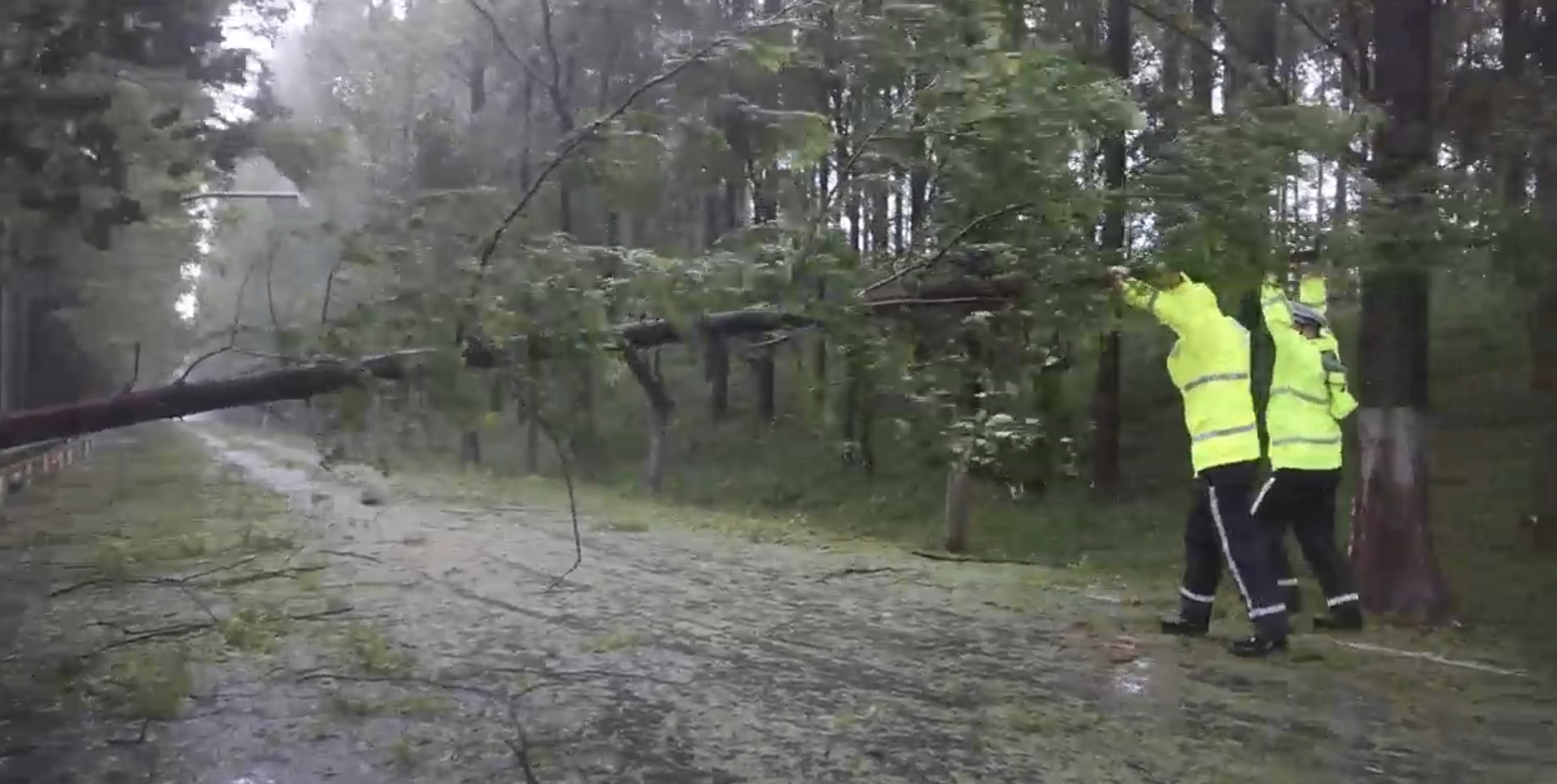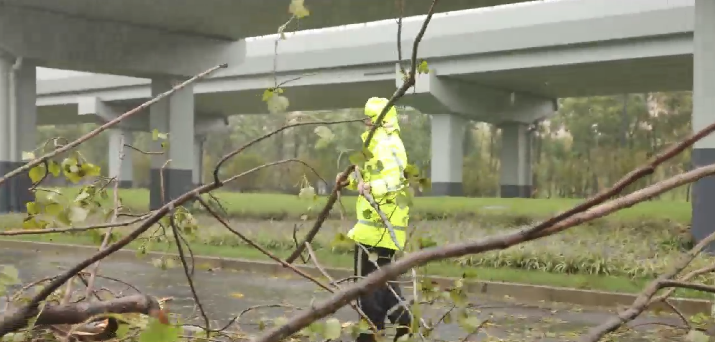 9月16日7时许, 澎湃新闻记者李佳蔚在台风“贝碧嘉”登陆点上海浦东临港新城 。记者从浦东公安分局了解到,16日清晨交警在方竹路塘下公路附近发现树木倒伏影响道路通行的情况,即现场开展道路清障工作,确保车辆安全通行。