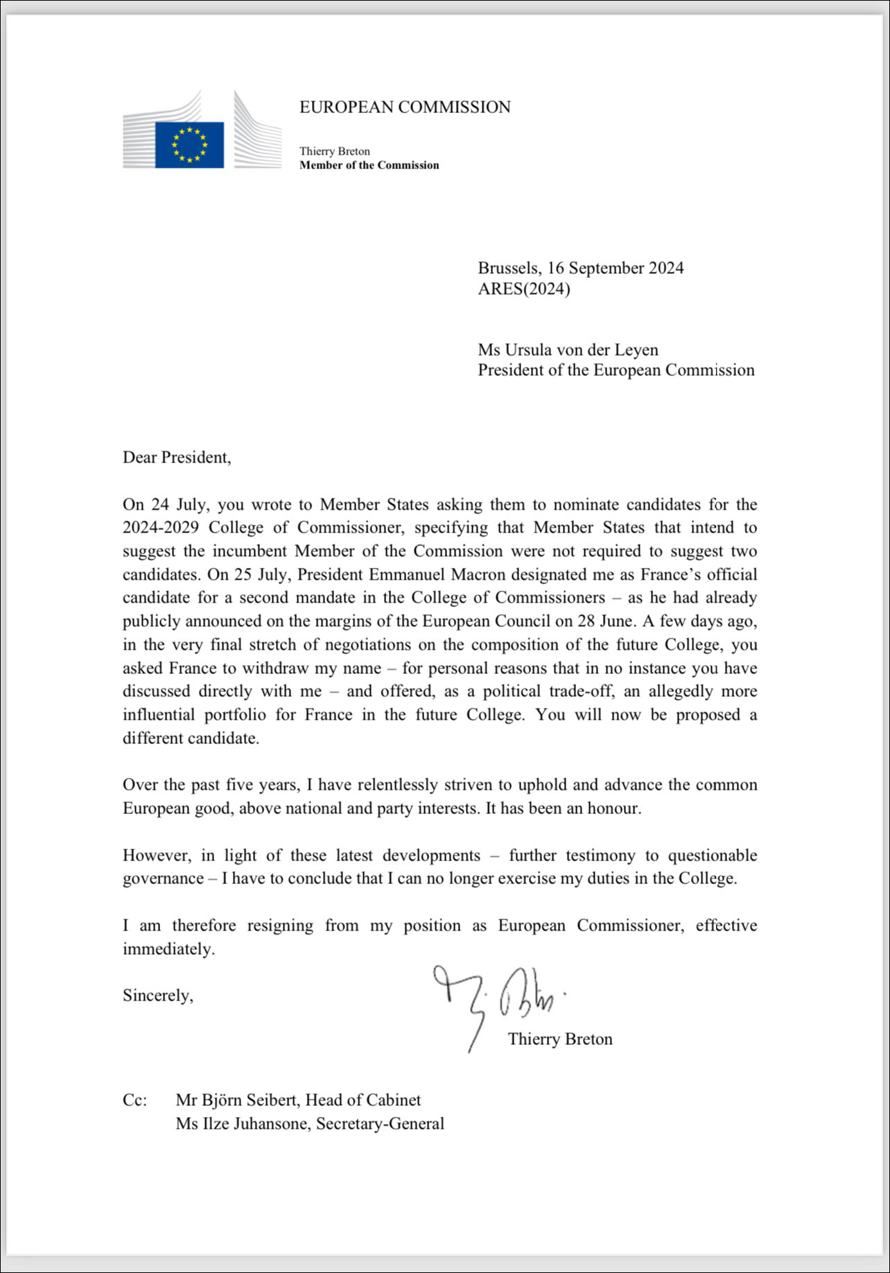 “鉴于这些最新的事态发展——这进一步证明(欧委会)治理存在问题——我不得不得出结论,我不能再履行我在委员会的职责。”布雷东写道,“因此,我将辞去我的欧盟委员一职,立即生效。”