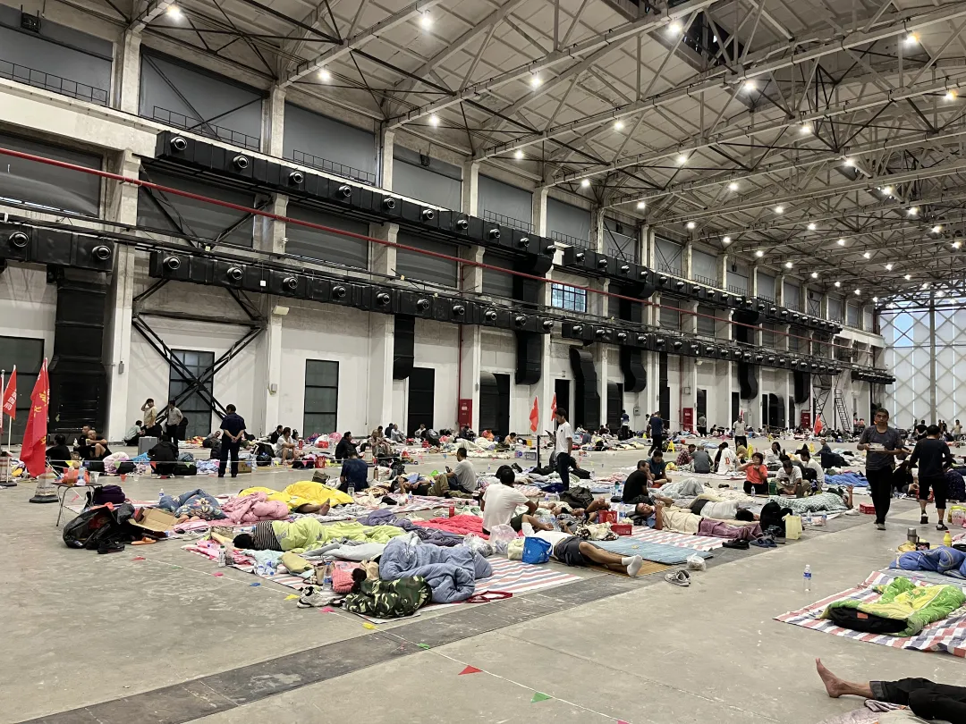 9月16日中午,记者来到了台风安置点之一的西岸艺术中心A馆,正值风雨影响最剧烈的时段,即便在场馆中,依旧能听到隆隆的风声和雨声,西岸周边工地的工友们或站或坐,正在午休,秩序井然。安置点中,两位“白衣天使”吸引了记者的注意。