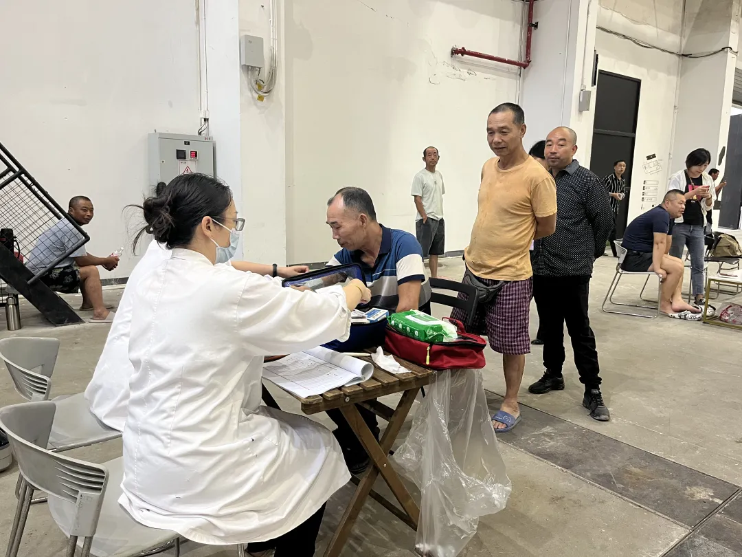“平时血压高吗?有定期服药吗?”龙华街道社区卫生服务中心的谢医生一边为工友测量血压,一边询问道。据谢医生介绍,龙华街道社区卫生服务中心派出了“一医一护”组合,携带应急药品和医疗用具,从15日下午3点左右,全天候驻守安置点,为工友们提供如测量血压、皮肤擦伤处理、受凉感冒等基本的医疗服务。
