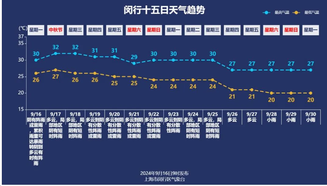节后上海主要处在副热带高压边缘,海上热带系统活跃,总体以多云天气为主,阵雨常出没。气温较之前有所下调,最低在25℃附近,最高30℃上下,午间热消减,早晚添凉意。