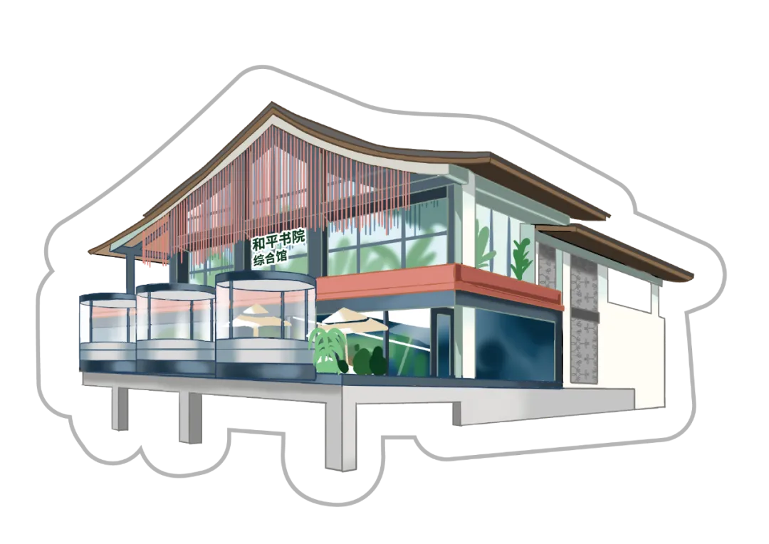 书院由综合馆、少儿馆、艺术馆及中心阅读绿地组成的城市公园阅读集群。少儿馆是以自然科学为馆藏主题,少年儿童和亲子家庭为主要服务对象的儿童友好图书馆;综合馆是以艺术人文为馆藏特色,生活与自然相融合的综合主题图书馆;和平艺术馆,以孵化、扶持当代青年艺术家群体为使命,由市民共建、共享的公共艺术空间;中心阅读绿地,是以公园绿地为场景,集户外阅读、公共展览、文艺演出、市集活动等多种功能于一体的公共开放活动空间。