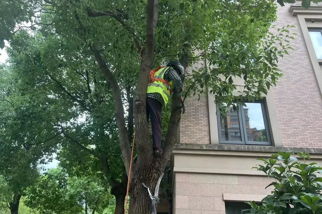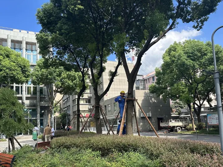 为做好极端天气下的古树名木及后续资源保护工作,及时安排人员检查古树加固安全及排水情况。对受风易倒的树木及时采取绑扎、加固、修剪等措施。