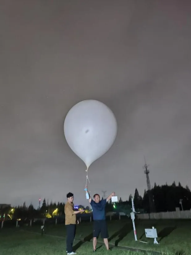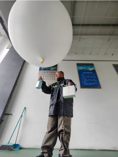 高空观测人员等待风力较小窗口期,及时施放探空气球