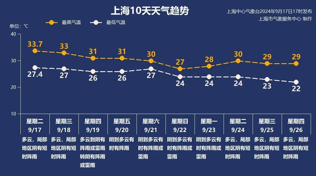 台风“贝碧嘉”在上海的影响翻篇了,今天(9月17日)除了一些小范围的太阳雨之外,无滤镜的碧空挂着绚美如画的云朵,足够养眼。气温也迅速回升,中心城区徐家汇站最高气温定格在33.7℃。这是继2005年中秋当天出现35℃高温之后最热的一个中秋节。预计夜晚延续多云天气,空气澄净,可以期待“彩云追月”。
