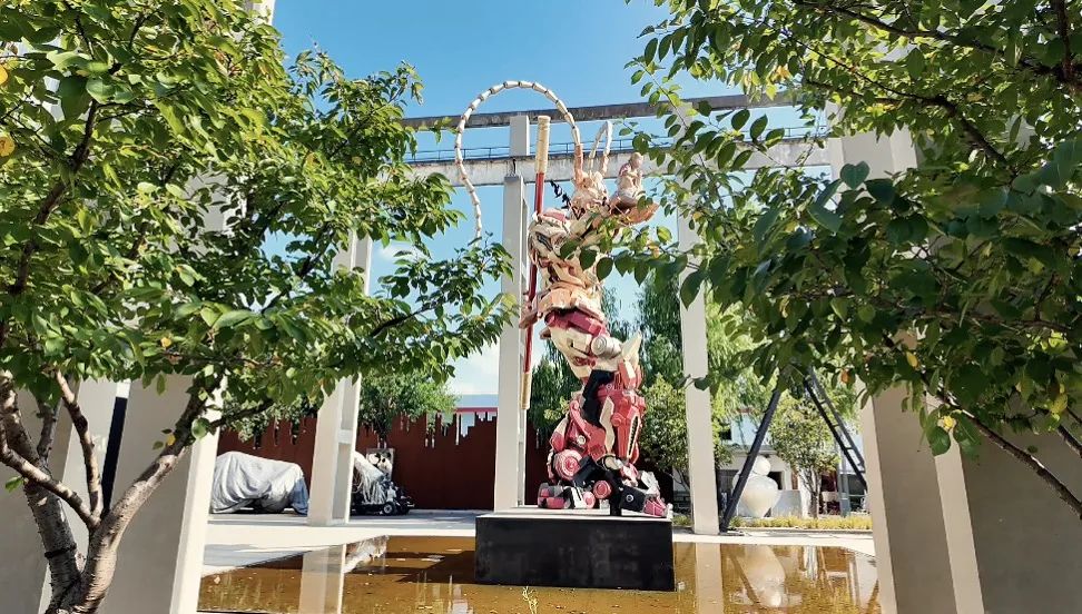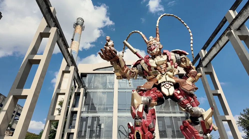 孙悟空,头戴凤翅紫金冠,手持如意金箍棒,这一经久不衰的神话传说角色在这里通过赛博朋克的方式进行呈现。自从游戏《黑神话:悟空》火遍全球,这座八米高的悟空机甲雕塑也成了游客打卡的热门点位。