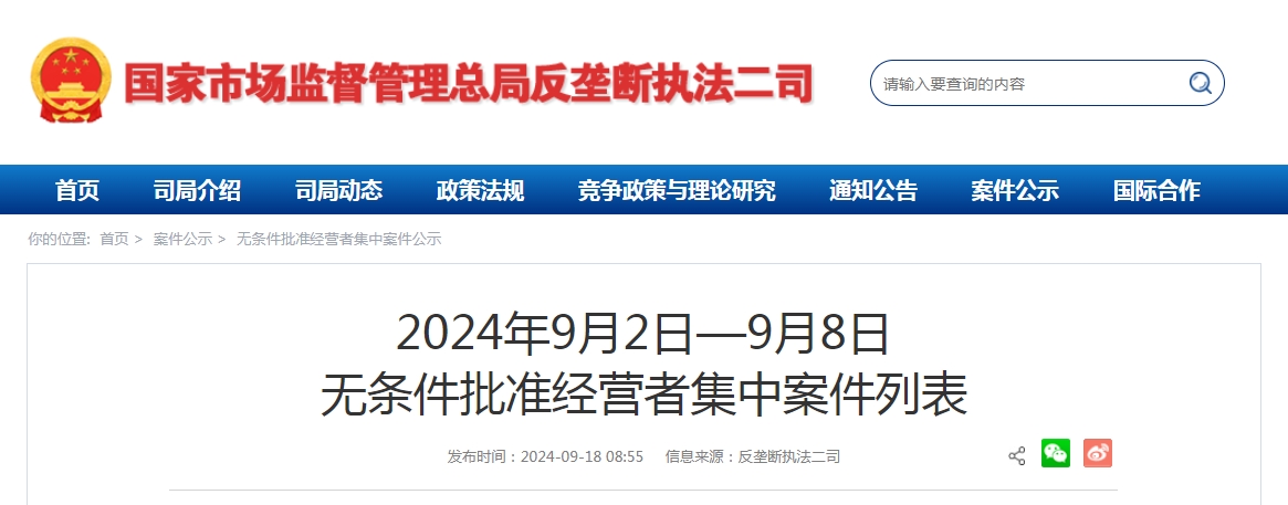 2024年9月2日—9月8日无条件批准经营者集中案件列表