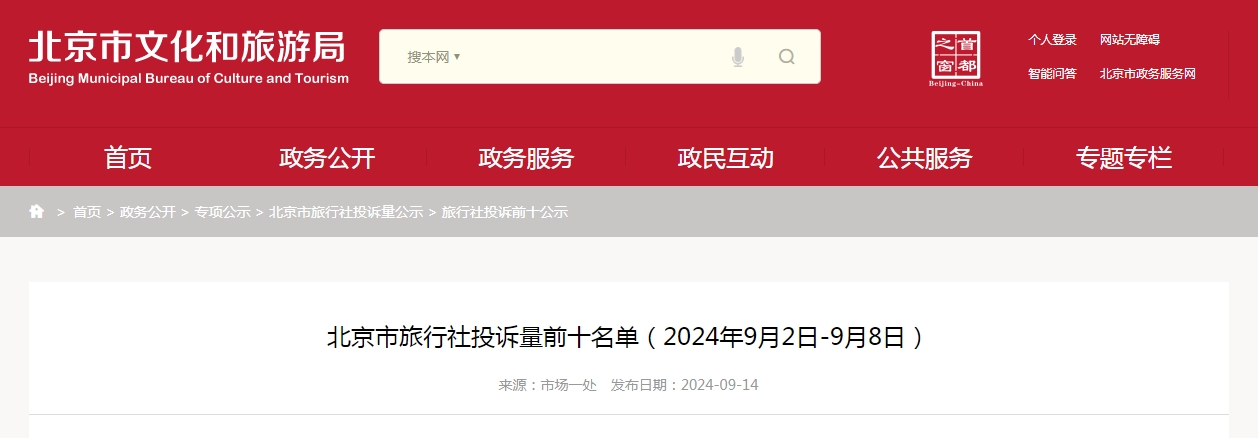 北京市旅行社投诉量前十名单(2024年9月2日-9月8日)