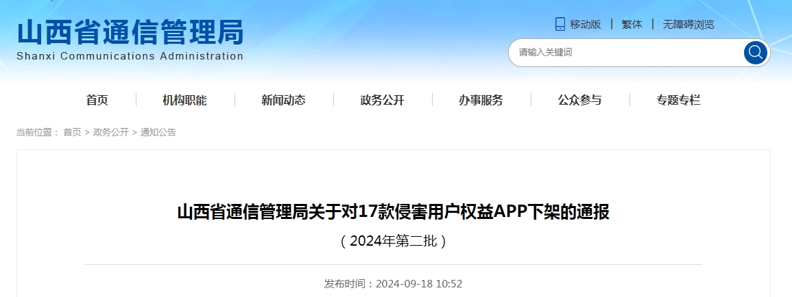 山西省通信管理局关于对17款侵害用户权益APP下架的通报(2024年第二批)