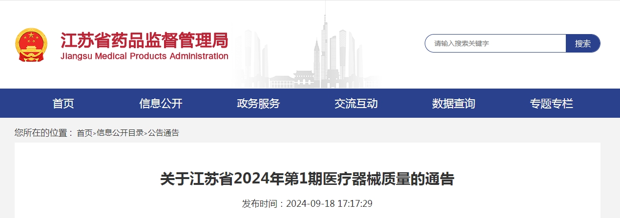 关于江苏省2024年第1期医疗器械质量的通告