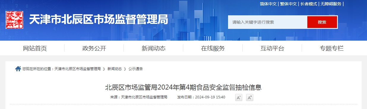 天津市北辰区市场监管局2024年第4期食品安全监督抽检信息