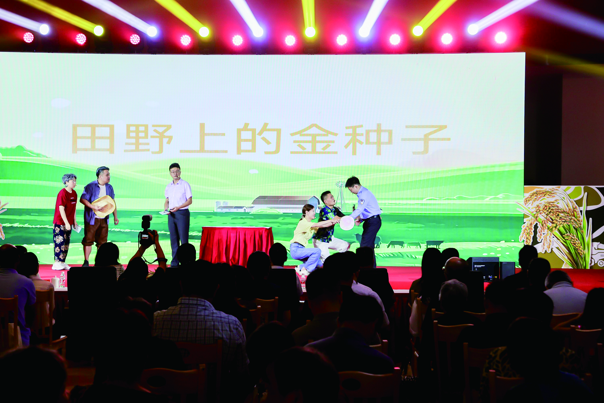 庆祝活动在《盛世龙腾庆丰收》舞蹈表演中拉开帷幕,文艺节目精彩纷呈。说唱《泖田新歌》作为松江非遗项目,唱出了泖田人响应党中央号召投身新农村建设的豪情与壮志,小品《田野上的金种子》讲述了金融为民、助民,守护农民权益的故事(见下图)。
