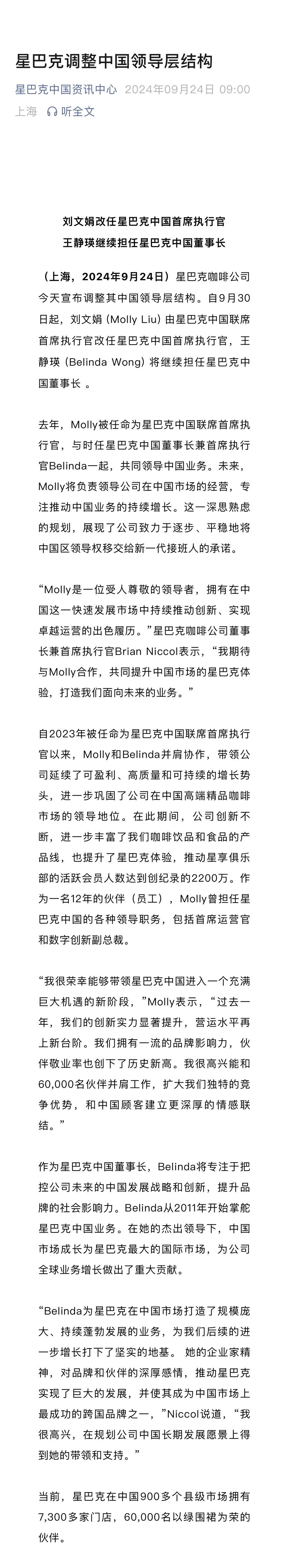 9月24日,星巴克咖啡公司宣布调整其中国管理层结构。自9月30日起,刘文娟(Molly Liu)由星巴克中国联席首席执行官改任星巴克中国首席执行官,王静瑛(Belinda Wong)将继续担任星巴克中国董事长。