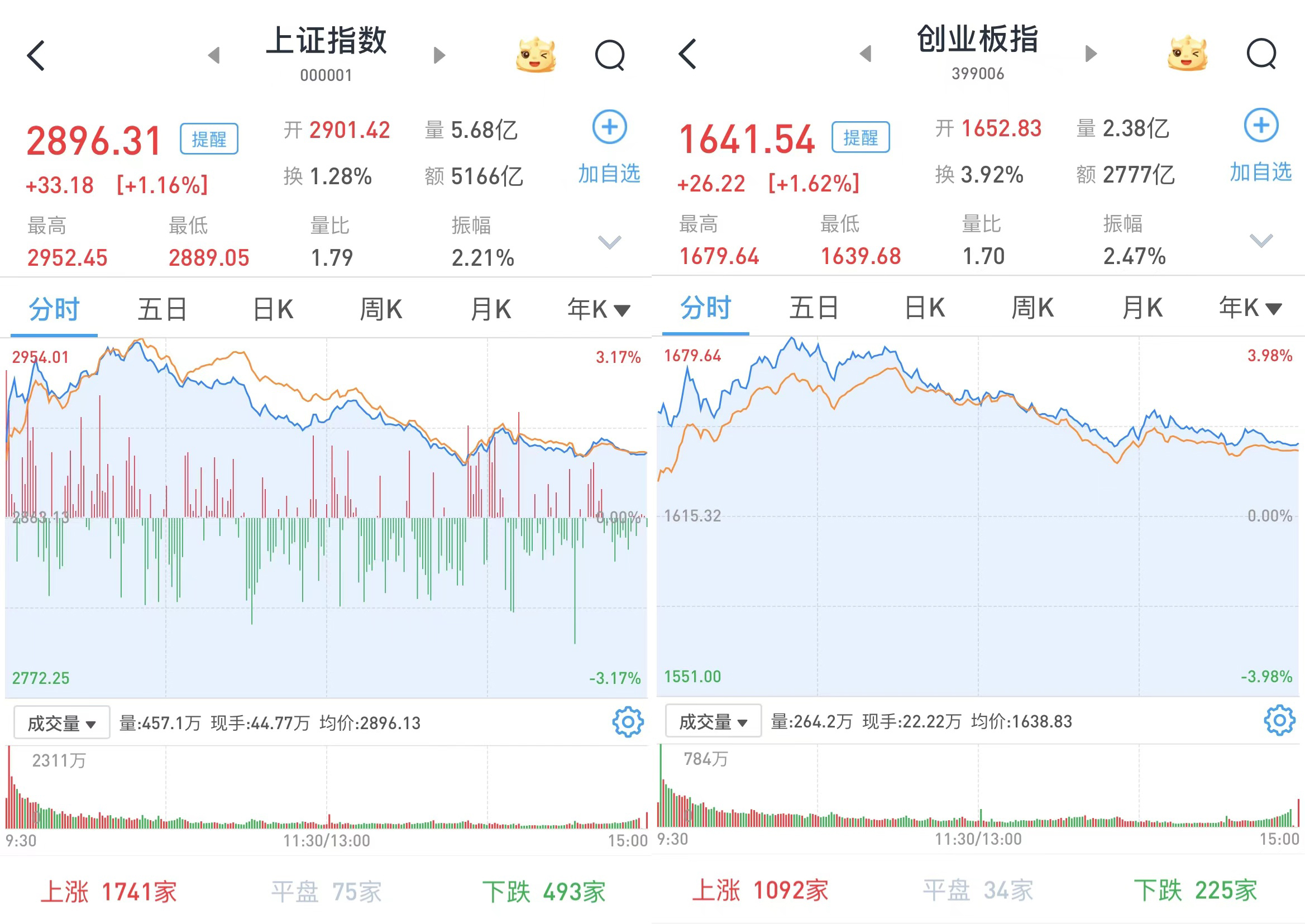 至收盘,上证综指涨1.16%,报2896.31点;科创50指数涨0.04%,报667.34点;深证成指涨1.21%,报8537.73点;创业板指涨1.62%,报1641.54点。