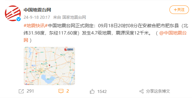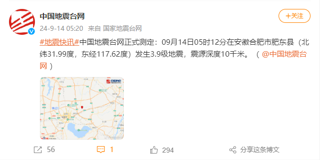 值得一提的是,这是肥东县本月内第三次地震,此前在9月18日、9月14日分别发生过4.7级和3.9级地震。