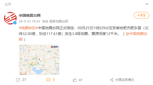 本月内第三次!安徽合肥市肥东县发生3.8级地震,此前最高震级达4.7级