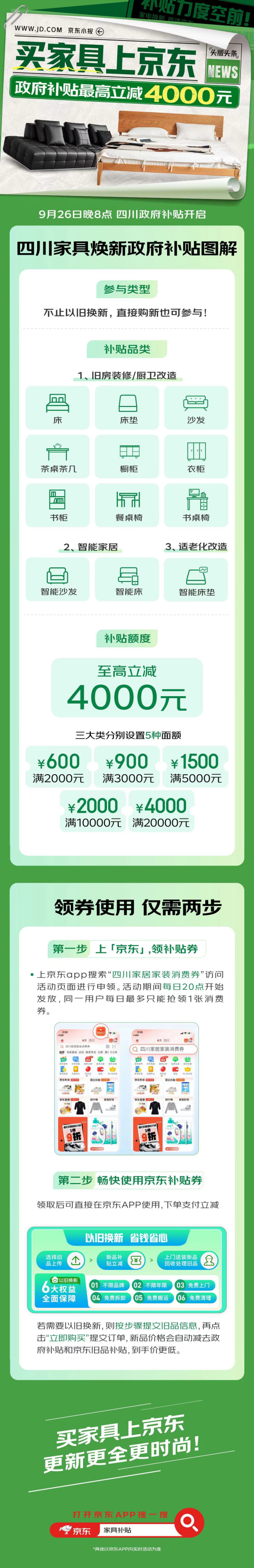 四川政府携手京东发福利了!近日,四川发布以旧换新方案,针对旧房装修/厨卫改造、智能家居、适老化改造三大类,共计30种家居家装产品给予“真金白银”补贴,总计补贴额度达7500万元!9月26日晚8点,2024“蜀里安逸·焕新生活”家居家装消费券正式开始发放,在京东购买床、床垫、沙发、书柜等多品类家具好物最高立减4000元,到手低至7折起,无论是以旧换新或是直接购新均可使用补贴。买家具上京东,大额补贴抢到即赚到!