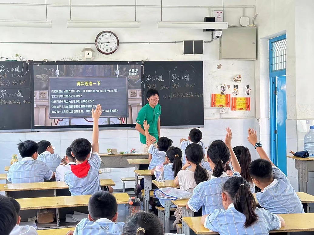 同时,我也结合了自己的成长经验与湖州支教的经历,为孩子们准备了“青少年青春期心理健康”和“人生拍卖会”这些趣味性与教育意义兼备的特色课程。我们同样在课间的时候与孩子们一起聊天、谈心,在只言片语中引导着他们对于网络信息等冲击的辨证思考,勾起他们对于纸质书籍的向往,与他们一起畅想未来、勾画希望的蓝图。我们也在第一周支教结束后与校长们及时沟通讨论,对发掘出的孩子们身上的问题进行思考,共同构思如何在他们未来的生活中构建对于网络信息等快餐文化的正确态度,努力引导孩子们树立正确的三观,培养健康的兴趣爱好。