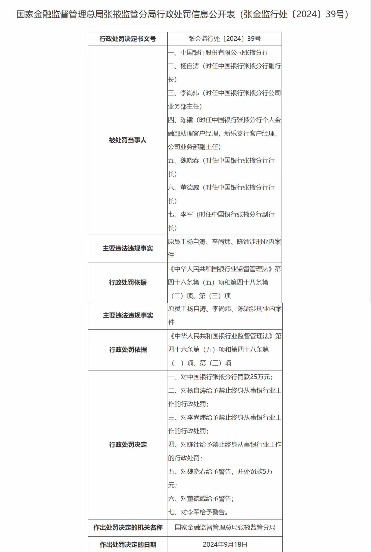 国家金融监督管理总局张掖监管分局(下称“张掖监管分局”)9月26日披露的行政处罚信息公开表(下称“罚单”)显示,中国银行张掖分行被罚款25万元,同时有6位责任人领罚,分别为时任中国银行张掖分行副行长杨自涛,时任中国银行张掖分行公司业务部主任李尚炜,时任中国银行张掖分行个人金融部助理客户经理、新乐支行客户经理、公司业务部副主任陈镭,时任中国银行张掖分行行长魏晓春,时任中国银行张掖分行行长董德威,时任中国银行张掖分行副行长李军。其中,杨自涛、李尚炜、陈镭被给予禁止终身从事银行业工作的行政处罚,魏晓春被警告并处罚款5万元,董德威、李军被警告。
