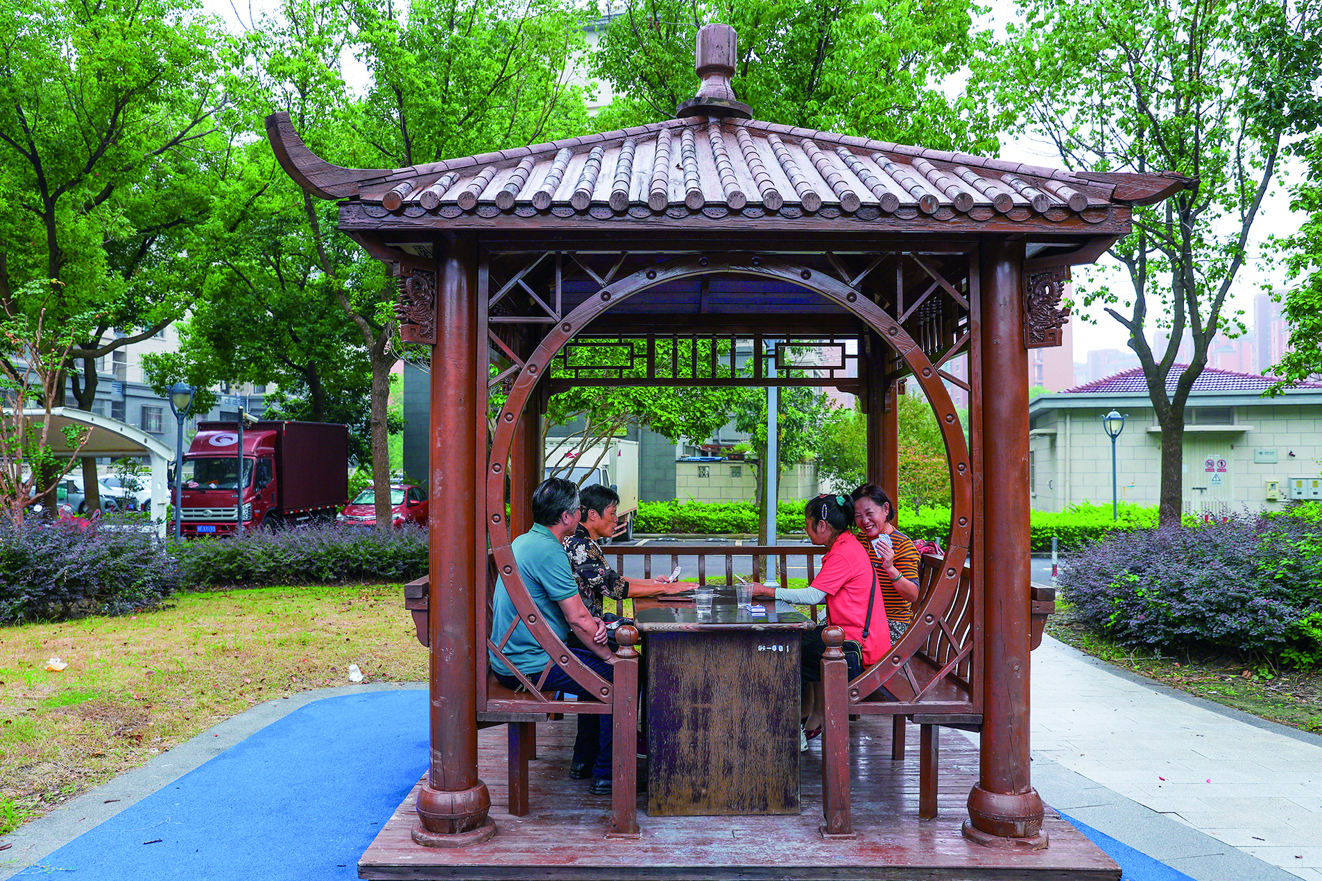9月25日,记者走进玉昆一期的健身花园,硅胶步道、凉亭、健身器材焕然一新,温馨的长廊和休息亭内,不少居民聊天散步、谈心小聚。