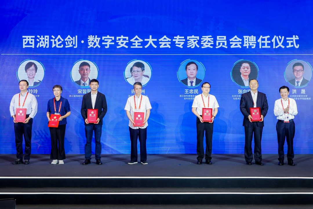 在此次数贸会上,“西湖论剑·数字安全大会”与全球数贸会实现了深度融合。今年4月份,西湖论剑·数字安全大会专家委员会(以下简称“专委会”)正式成立,此次专题会议上再次举行专家受聘仪式。中国网络空间研究院原院长夏学平,浙江省政府咨询委委员、省经济和信息化厅原副厅长、一级巡视员厉敏,浙江省机要局原局长许绍州,浙江省科普联合会副会长、省科协原副主席王忠民,浙江省网络空间安全协会理事长宋皆荣,北京交通大学信息管理理论与技术国际研究中心教授张向宏,杭州电子科技大学原副校长孙玲玲女士,北京航空航天大学网络空间安全学院副教授洪晟等受聘为西湖论剑专委会专家委员。