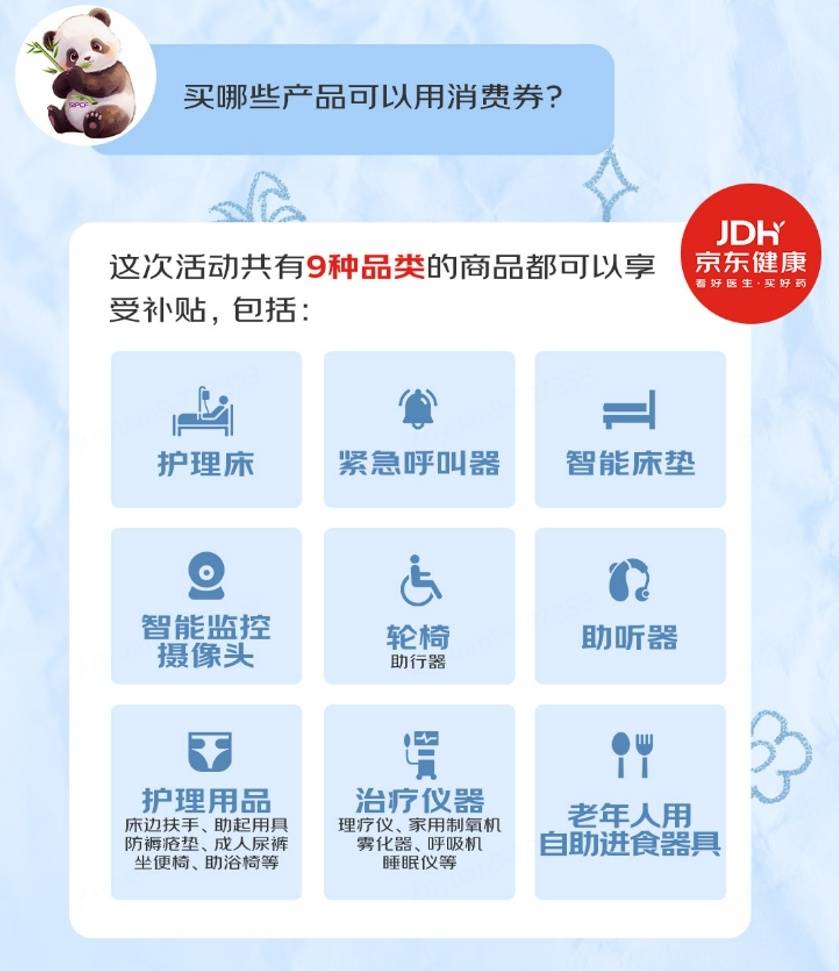 本次“四川养老消费券”,将覆盖助行、助浴、助听、助餐等场景,包括:护理床、紧急呼叫器、智能床垫、智能监控摄像头、轮椅(助行器)、助听器、护理用品(床边扶手、助起用具、防褥疮垫、成人尿裤、坐便椅、助浴椅等)、治疗仪器(理疗仪、家用制氧机、雾化器、呼吸机、睡眠仪等)、老年人用自助进食器具等9 种商品。