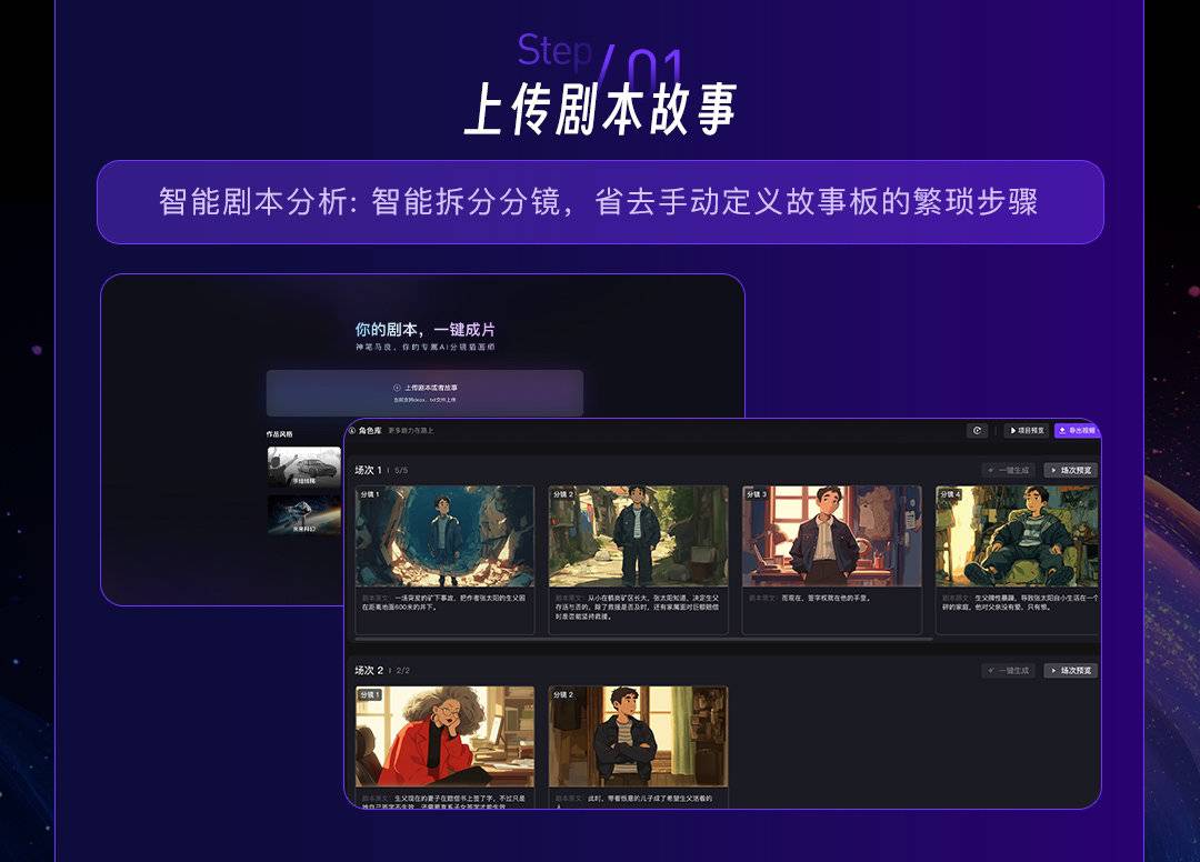 据悉,“神笔马良”对于长剧本内容优势显著。它所具备的“一键成片”能力,能够根据用户上传的剧本实现影视级别的解析,生成动态故事板视频,一站式完成从文字到影像的繁琐工作,极大地满足了影视行业在创作阶段需要的准确性和一致性。通过“神笔马良”导出的动态故事板视频,用户可在项目提报、创投路演、创意阐释、剧本会议、分镜设计等前期的多个阶段加以应用,解放生产力,为创作提速增效。