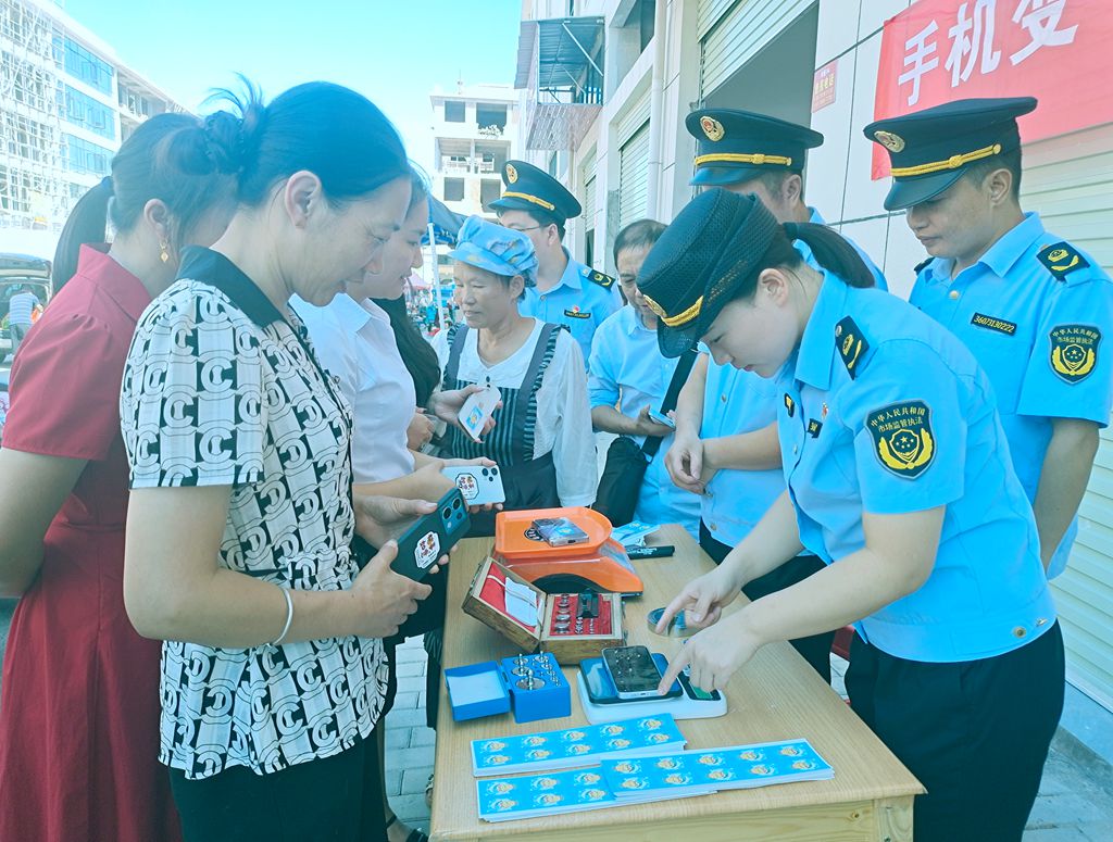 活动现场,执法人员将群众携带的手机放至专业的计量设备上,测出手机重量后,在背面加贴统一印制的重量标签,让群众的手机秒变成随身携带的“砝码”。