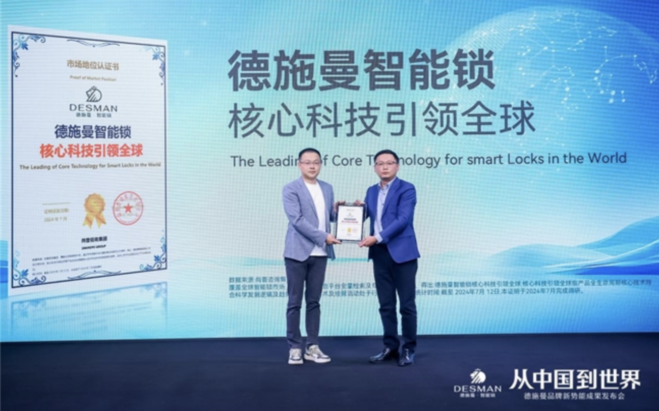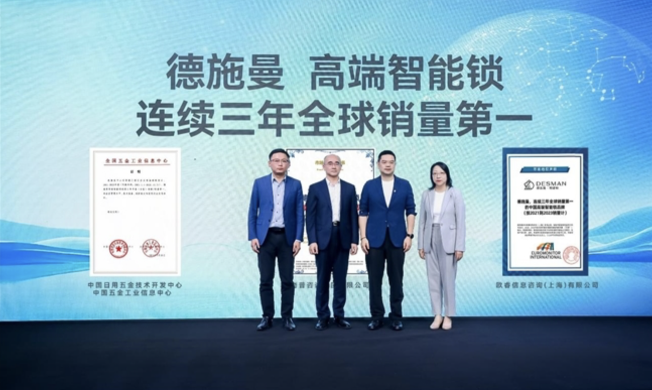 发布会现场,国家科委批准成立的中国日用五金技术开发中心、欧睿信息咨询公司、尚普咨询集团共同发布了德施曼高端智能锁“连续三年全国销量第一、全球销量第一”认证以及“核心科技引领全球”认证。