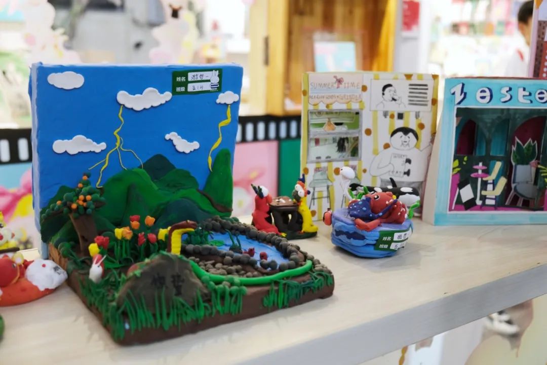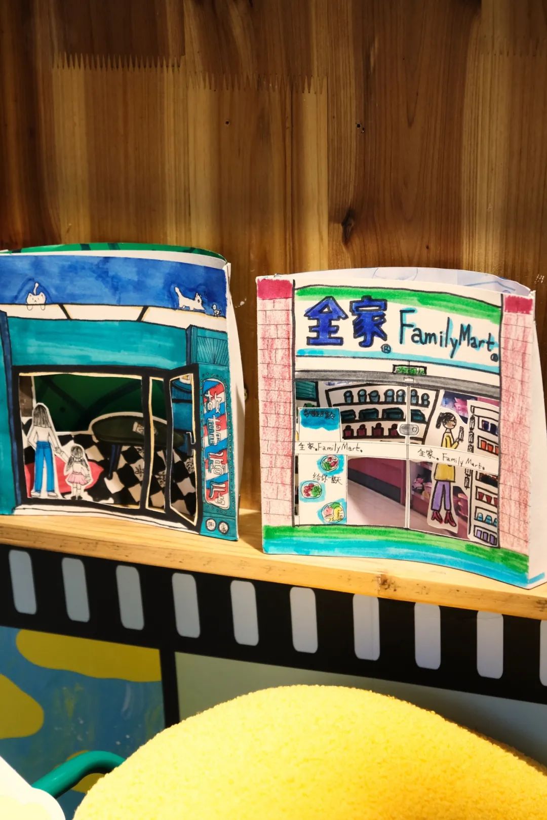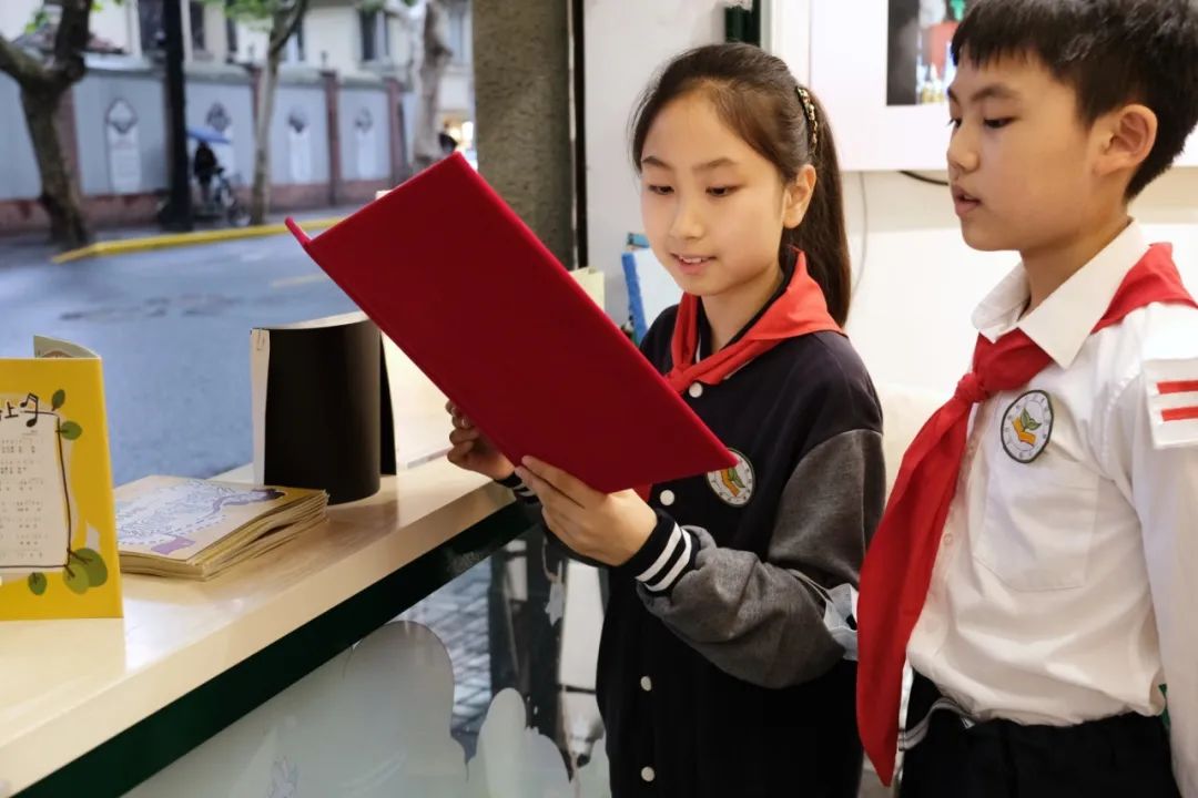 而在故事商店的窗前,摆放着愚一学生亲手制作的面塑、立体绘画等美术作品。别出心裁的美术作品仿照愚园路上的各个商店,绘制成“迷你版”的立体门头,展现出孩子们心中独特、多彩的愚园印象。一旁几本《侬好,愚园路》征文选和《愚园路红领巾寻访手册》则堆成厚厚一叠,诉说着无数个愚一学生与愚园路的温暖回忆和成长故事。