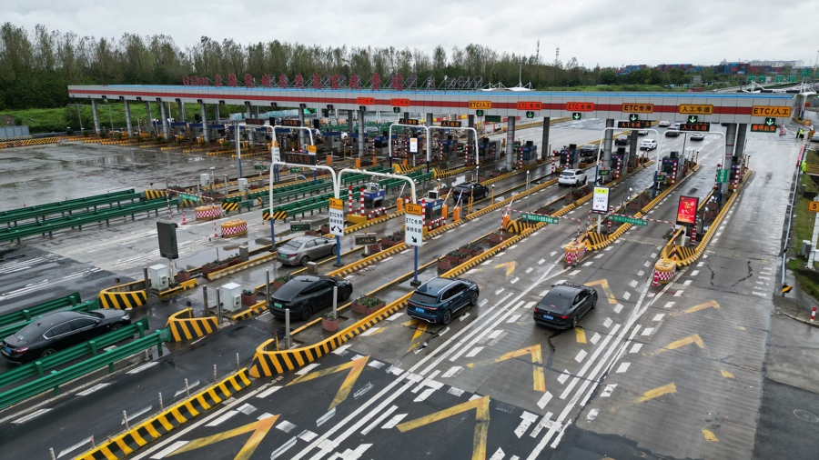 上海高东收费站迎出城车流高峰,排队缓行情况凸显!警方用无人机取证交通违法