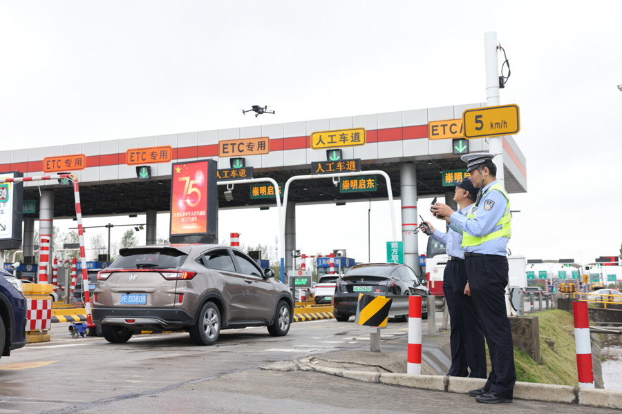 国庆假期首日,G1503高东收费站迎来出城车流高峰,多条连接道路从一早便出现车辆排队情况。浦东警方充分部署警力对沿线关键道口及交汇点加强现场指挥管理,利用无人机巡航监测流量变化、辅助取证易致堵致祸的交通违法行为。