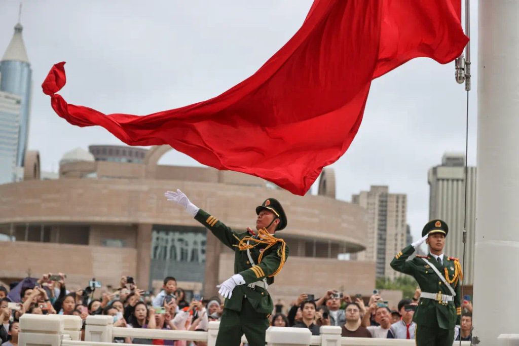 同日上午,在不远处的上海人民广场升旗台,众多市民游客自发前来,见证五星红旗冉冉升起。