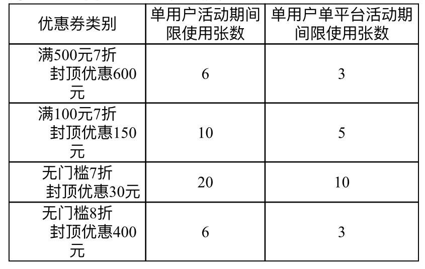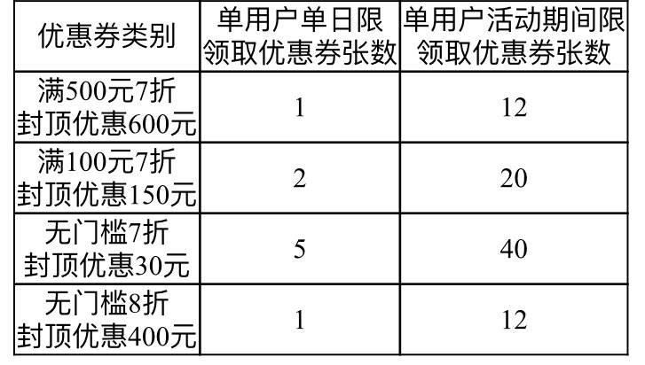 单用户每个活动日及整个活动期间各类消费券领取张数限制如下: