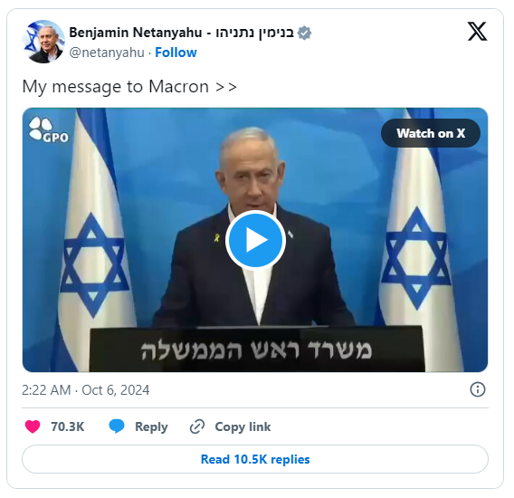 综合法国媒体和以色列媒体报道,为回应法国总统马克龙对以禁运武器的呼吁,以色列总理内塔尼亚胡10月5日晚间通过其办公室发布视频声明称:“今天,以色列正在七条战线上捍卫自己,对抗‘文明的敌人’。当以色列打击伊朗领导的‘野蛮势力’时,所有‘文明国家’都应该坚定地站在以色列一边。然而,法国总统马克龙和其他西方领导人却在呼吁对以色列实施武器禁运。”