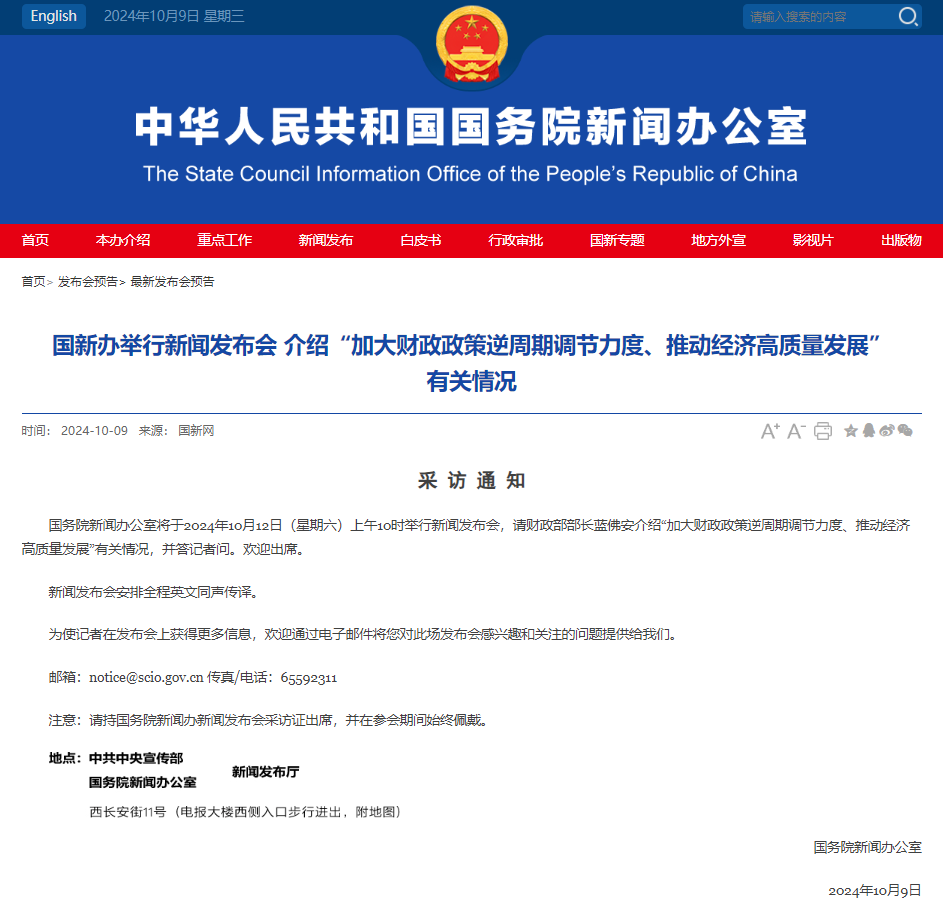 国务院新闻办公室将于2024年10月12日(星期六)上午10时举行新闻发布会,请财政部部长蓝佛安介绍“加大财政政策逆周期调节力度、推动经济高质量发展”有关情况,并答记者问。