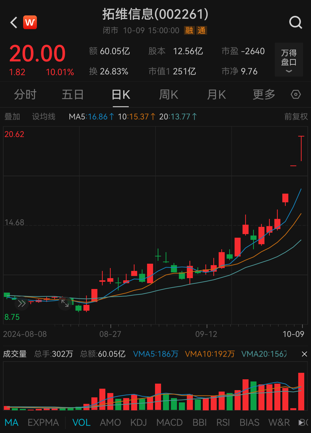 拓维信息连续3个交易日涨停,10月9日收于20元,与9月27日收盘价15.03元相比涨幅达33.06%;与8月21日收盘价9.48元相比,涨幅达110.97%。