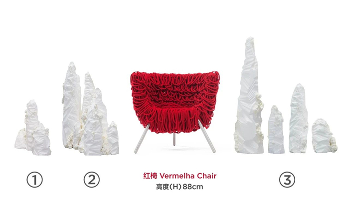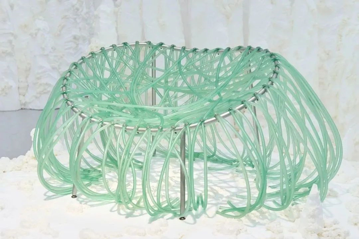 在坎帕纳工作室的创作中,泡沫材料不仅是一种媒材,更是其艺术表达的一部分。展出作品如“卡拉狄加(星系)书架”和“流星扶手椅”就是通过回收街头被丢弃的、来自家用电器包装中的泡沫材料制作而成。坎帕纳兄弟将这些废弃的泡沫压制成型,包裹以金属色的皮革,打造出表面坚硬、内核柔软的不同作品。另一件受欢迎作品“海葵椅”外观形似摆动着触须的海葵。它是用花园里常见的塑料水管制成的,无规则的PVC水管经过弯曲与编织,形成了一个有机的整体。这个设计案例凸显了艺术家擅长使用废弃或日常材料制作创意家具的风格,同时也体现了对于环境友好的关注。