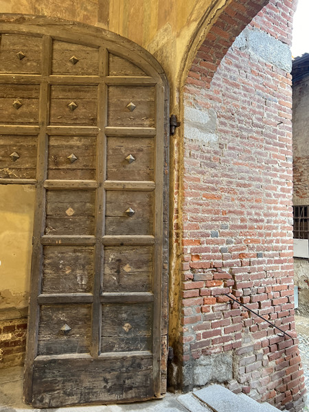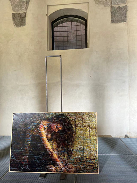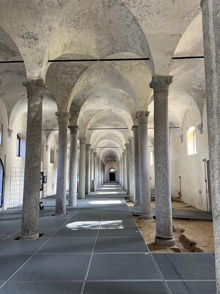 134米长、48米宽的维杰瓦诺大公广场,三面有围墙,总共有84个柱子——柱子上方有着罗马和文艺复兴时期的人物或者格言,每一根柱子的柱头都各不相同。它的第四面则是一座教堂,由弗兰西斯科·斯福尔扎二世于1532年起建造。作为意大利第一个以古罗马广场为灵感修建的广场,两侧共有33个拱门。修建这一广场的1492年,也是哥伦布发现美洲新大陆的同一年。此时,意大利的金属加工和羊毛加工也颇为先进,农业技术也颇为发达,吸引了热衷科技与艺术的达·芬奇来到这里。当时,广场中间还有一个坡道与塔楼相连,可以直接骑马进入城堡。广场,是城堡的“门面”,也是其尊贵的“庭院”,乃至成为“大型会客厅”——且充满壁画装饰。当时,这个城堡是个极具魅力的“贵宾楼”,接待的贵宾包括法国国王。目前,我们看到的壁画,是1900年的重绘版……奇妙的是,在城堡内,正在布展,准备举办一个数码时代下的绘画展,绘画主题展现了数字时代对人本主义的影响。在一个文艺复兴时期建造的城堡里观赏数字时代的绘画确实颇有神奇的穿越感。