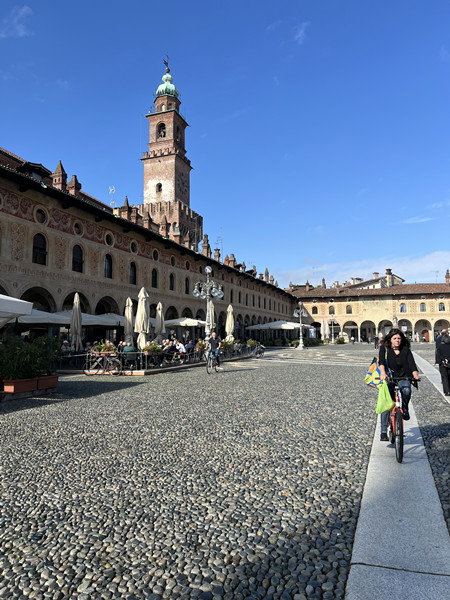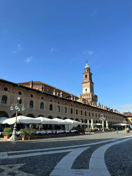 通向维杰瓦诺宫廷的广场上,有一座文艺复兴时期著名画家、建筑师多纳托·伯拉孟特(Donato Bramante)建造的塔楼,塔楼里有达·芬奇留下的痕迹,证明他曾经参与了建造……而这个建于1492年的维杰瓦诺大公广场,是意大利文艺复兴时期起,第一个以古罗马广场为灵感修建的广场。因而,如果我们要寻觅意大利文艺复兴的足迹,就应该自维杰瓦诺开始——虽然,我们造访这个小镇的最初原因,是因为国际体育记者协会(AIPS)主席乔瓦尼·梅罗(Gianni Merlo)盛情邀请:“欢迎来我的小镇!”他在小镇上土生土长,备受尊重。办公点正是他自己的家,电脑上有一张大照片,他的双臂恰好抱着矮他一头的法国总统马克龙——正是今年巴黎奥运会期间。当时,恰逢国际体育记者协会成立100周年,在联合国教科文组织的现场,举办了100周年庆典。