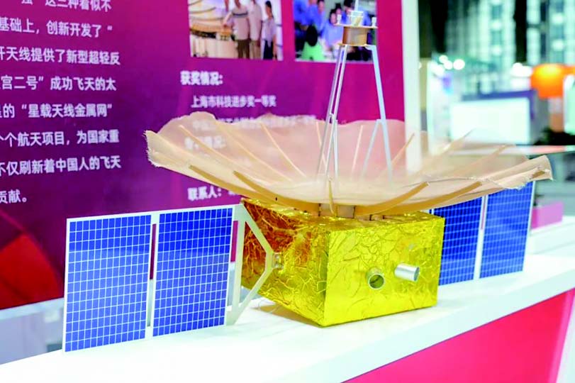 东华大学纺织学院陈南梁团队研发的大型星载可展开天线金属网材料重磅亮相。据悉,该技术已成功应用于我国发射的世界首颗高轨合成孔径雷达卫星(SAR)——陆地探测四号01星,让卫星在浩瀚的宇宙中既能看得广、看得细,还能看得快、看得清。据团队骨干蒋金华教授介绍,团队采用极细金属钼单丝进行编织,摒弃传统网状经编织物编织思维定式,创新研发了“微张力”经编网状织物编织新技术及装备,让卫星天线兼具轻、大、强这三种看似不可兼容的特性,用现代纺织技术成功服务国家航天事业。