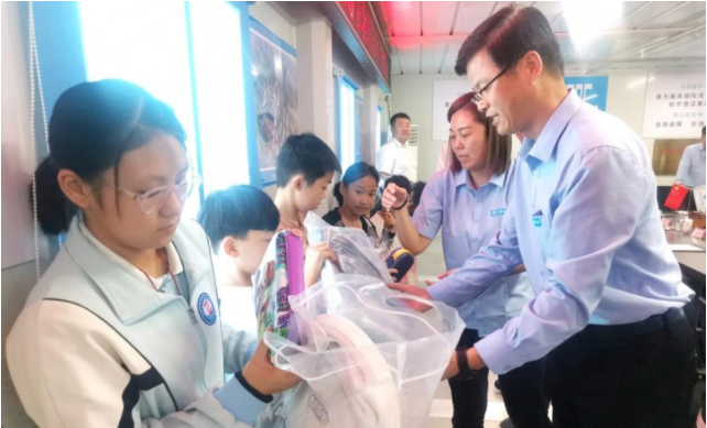 ▲项目领导给孩子们发放学习“大礼包”,孩子们高兴地拿起书包、学习文具,感谢项目领导。