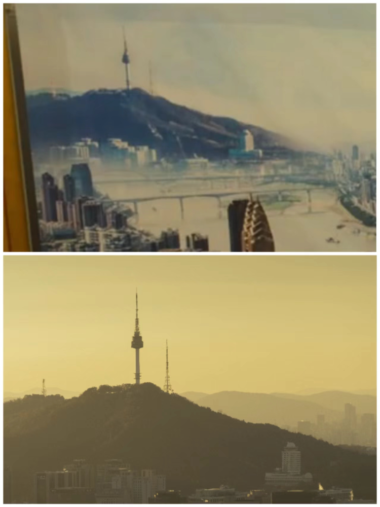对于风景画左上角疑似首尔塔的建筑,冉先生分析:“这部分应该是电脑合成的,图片前部分是重庆,后面部分是首尔南山的首尔塔。”