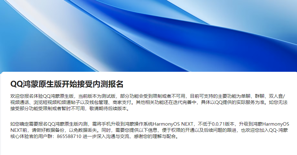 无独有偶,QQ鸿蒙原生版也已开始接受内测报名。腾讯方面表示,当前版本为测试版,部分功能会受到限制或者不可用,目前可支持的主要功能为单聊、群聊、双人音/视频通话、浏览短视频和频道帖子以及钱包管理、商家支付。其他相关功能还在迭代完善中,具体以QQ提供的实际服务为准。