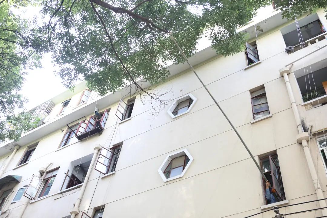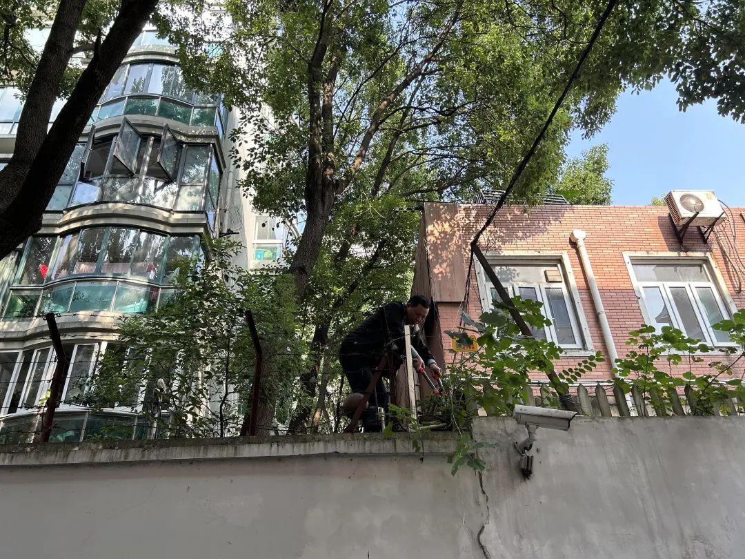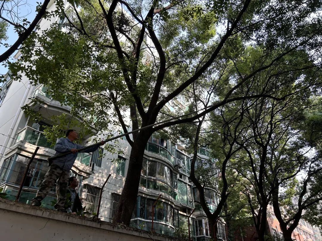 “可以一次少剪一些,剪短一些,不要砸到过道内的雨棚与玻璃公示板。”“注意头顶,不要砸到来往的居民。”修剪当天,街区综合网格工作站工作人员、居委干部、物业工作人员、业委会成员以及志愿者们共同到场,提醒修剪师傅注意公共设施,维持着现场秩序。在多方努力下,通过精心修剪,一根根阻挡阳光的枝条应声而落,久违的阳光重新洒满了居民们的窗台。