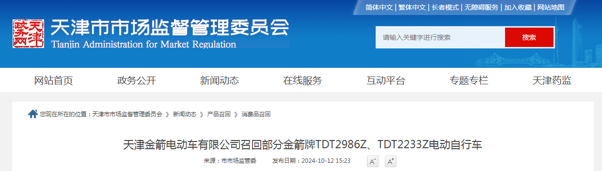 天津金箭电动车有限公司召回部分金箭牌TDT2986Z、TDT2233Z电动自行车