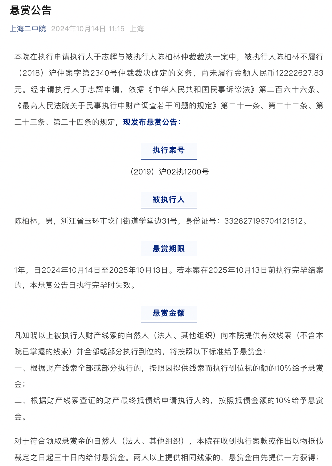 10月14日,上海市第二中级人民法院(下称“上海二中院”)在微信公众号中发布了一则悬赏公告显示,上海二中院在执行申请执行人于志辉与被执行人陈柏林仲裁裁决一案中,被执行人陈柏林不履行(2018)沪仲案字第2340号仲裁裁决确定的义务,尚未履行金额人民币1222.26万元。经申请执行人于志辉申请,依据相关规定,上海二中院发布悬赏公告。被执行人为陈柏林,男,57岁;悬赏期限显示为1年,自2024年10月14日至2025年10月13日。若该案在2025年10月13日前执行完毕结案的,悬赏公告自执行完毕时失效。