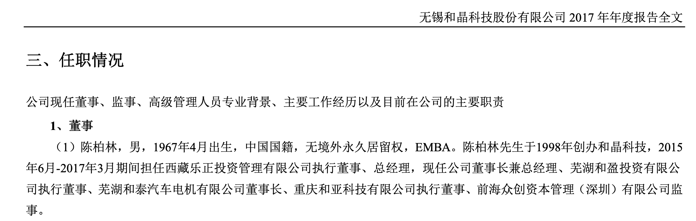 据和晶科技此前2017年披露的年报信息,陈柏林,男,1967年4月出生,中国国籍,无境外永久居留权,EMBA。陈柏林于1998年创办和晶科技,2015年6月至2017年3月期间担任西藏乐正投资管理有限公司执行董事、总经理,现任公司董事长兼总经理、芜湖和盈投资有限公司执行董事、芜湖和泰汽车电机有限公司董事长、重庆和亚科技有限公司执行董事、前海众创资本管理(深圳)有限公司监事。