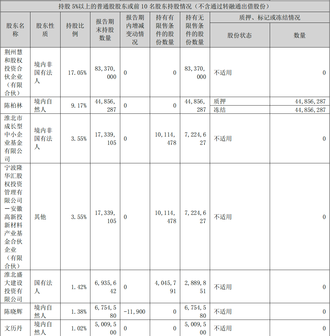 和晶科技2024年半年报显示,目前荆州慧和股权投资合伙企业(有限合伙)为第一大股东,持股比例为17.05%;陈柏林为第二大股东,持股比例为9.17%。